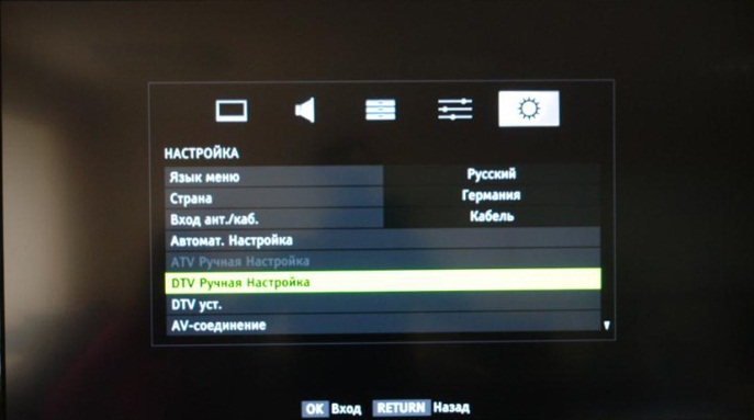 Если в вашей модели ТВ предусмотрен приём цифровых каналов, но отсутствует пункт "DTV MENU", то предварительно выбираем другую страну – Францию, Швейцарию, Швецию или Финляндию.